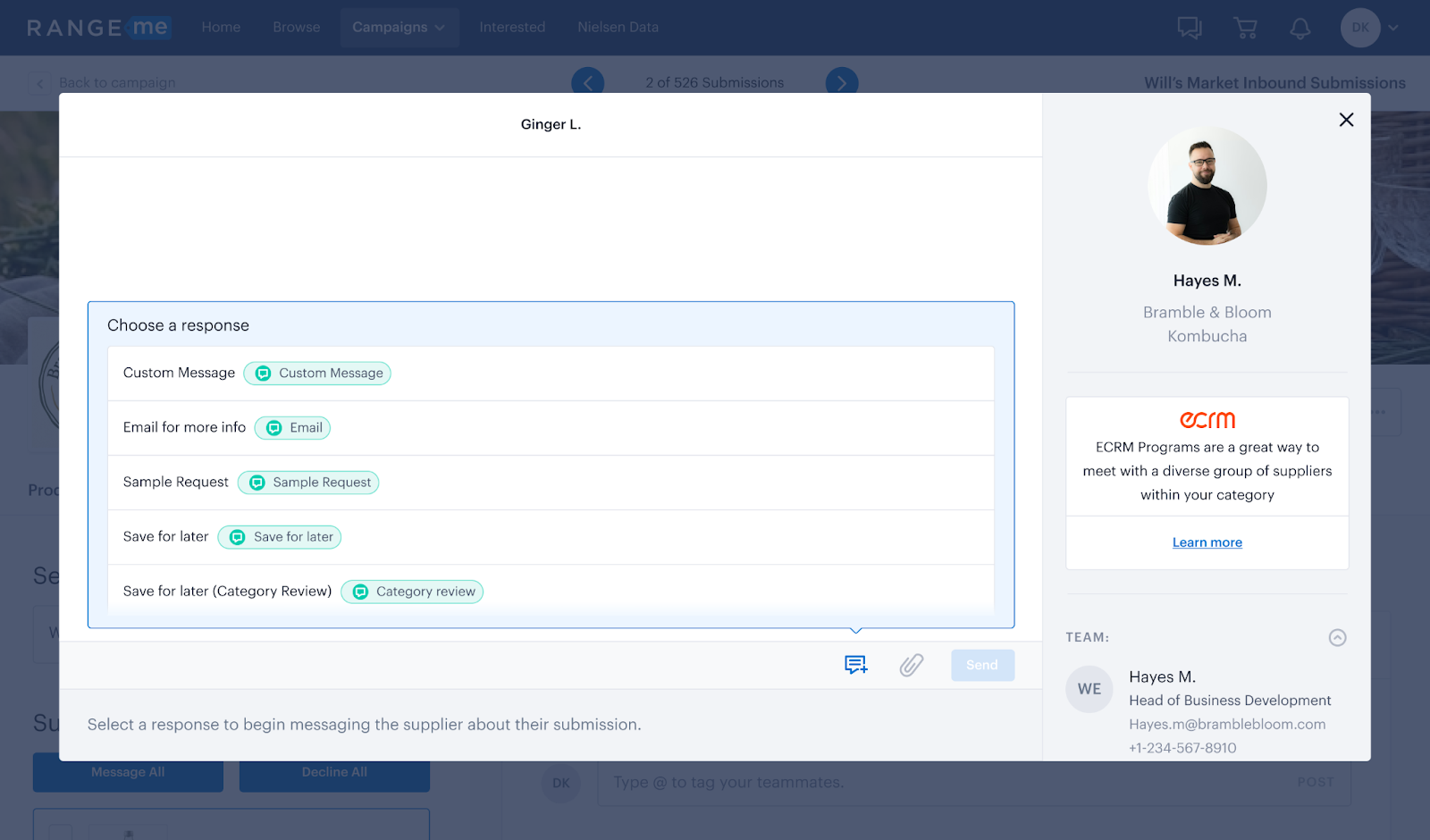 - Customize & Send: Edit the template text as needed. Click Send to notify the supplier, and the submission will move to your Messaged submissions tab.