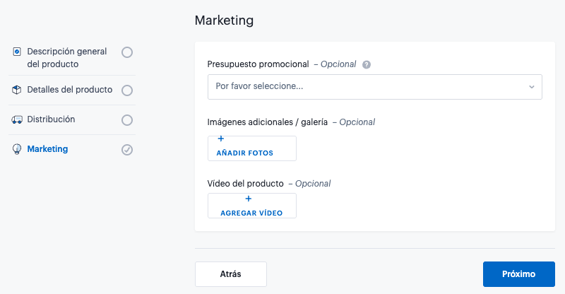 La Sección de Marketing en los Formularios de Carga de Producto es la cuarta sección. Tenga en cuenta que esta sección solo se llenará después de que tenga al menos un producto publicado.