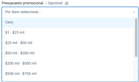 Este campo le permite seleccionar el rango de precio que mejor describe su presupuesto anual de marketing para este producto. Seleccione un rango del menú desplegable o deje este campo en blanco.