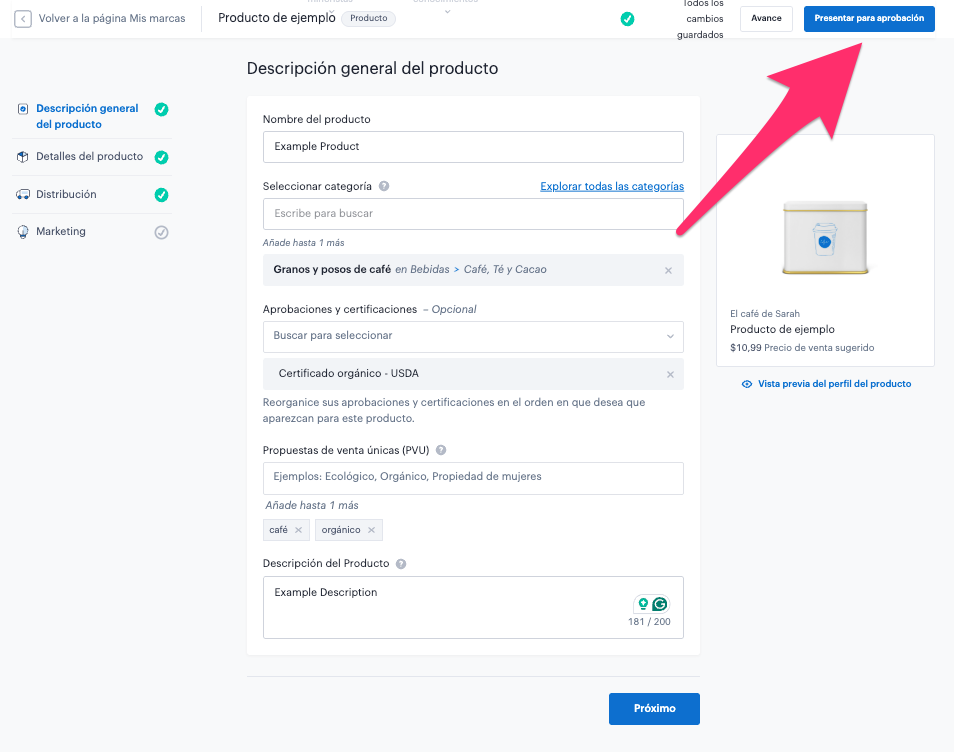 Puede hacer ediciones a sus productos o perfil en cualquier momento. Una vez que haya terminado de editar, haga clic en el botón "Enviar" en la parte superior de la página para publicar cualquier cambio realizado. Cualquier campo que requiera que su producto pase a Estado Pendiente después de ser re-enviado se llama Campo Crítico. Aprenda más sobre lo que eso significa aquí.