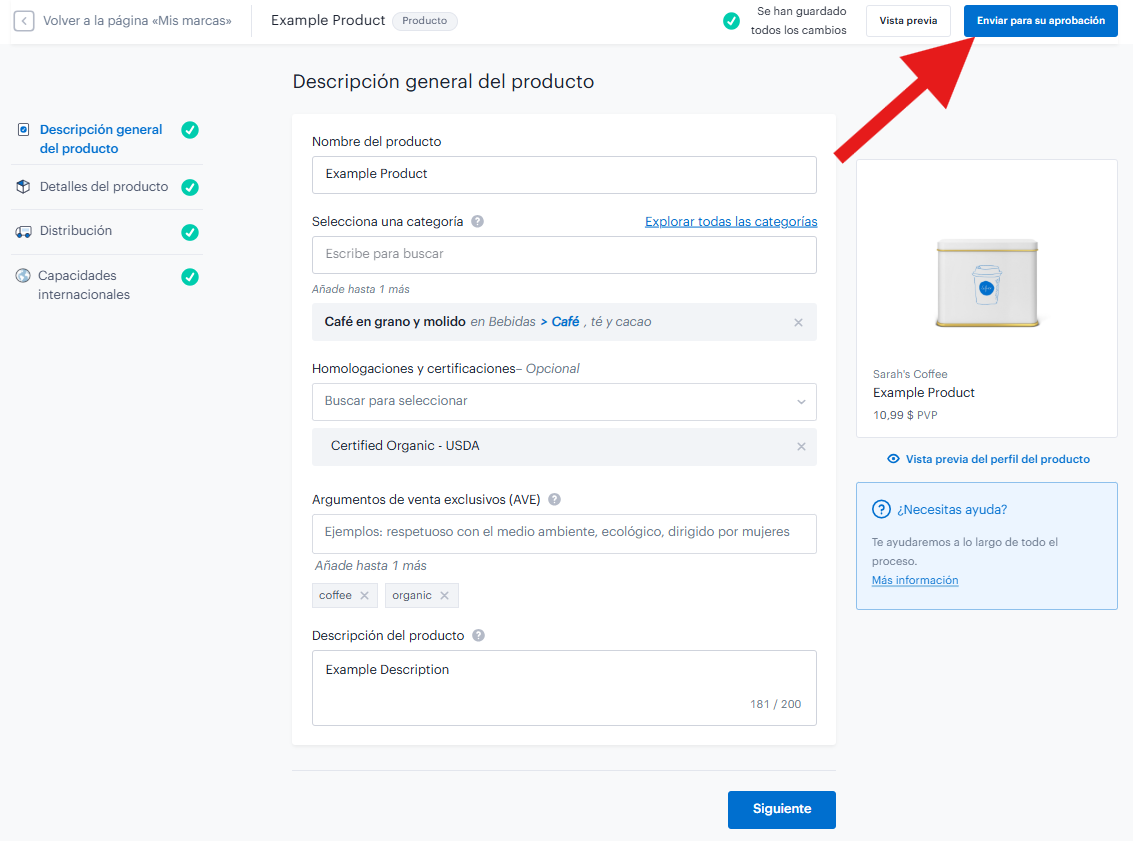 Después de hacer clic en Enviar para Aprobación, uno de los Especialistas de Productos de RangeMe revisará su producto dentro de 24 a 48 horas durante la semana laboral.