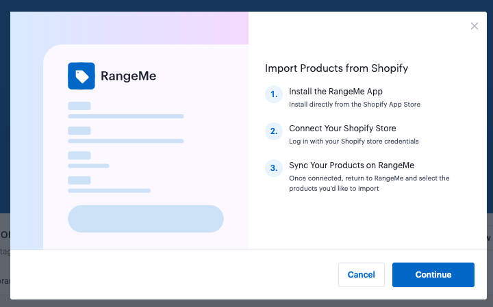 Verás un breve resumen de cómo vincular tus cuentas. Haz clic en el botón azul Continuar para ser enviado a la lista de la aplicación RangeMe dentro de la tienda de aplicaciones de Shopify.