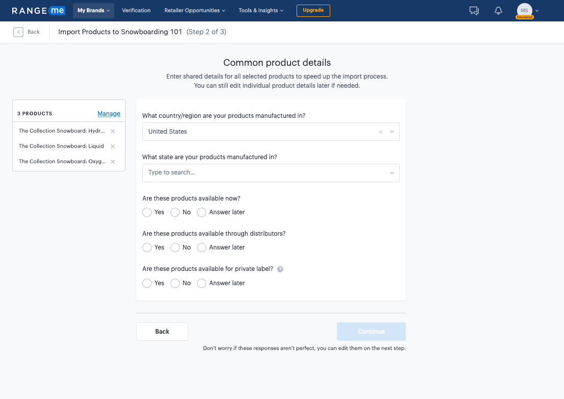 Aquí, completarás algunos detalles faltantes requeridos para publicar tus productos en tu perfil de RangeMe. Ten en cuenta que la información que proporciones se aplicará a todos los artículos seleccionados para esta importación.