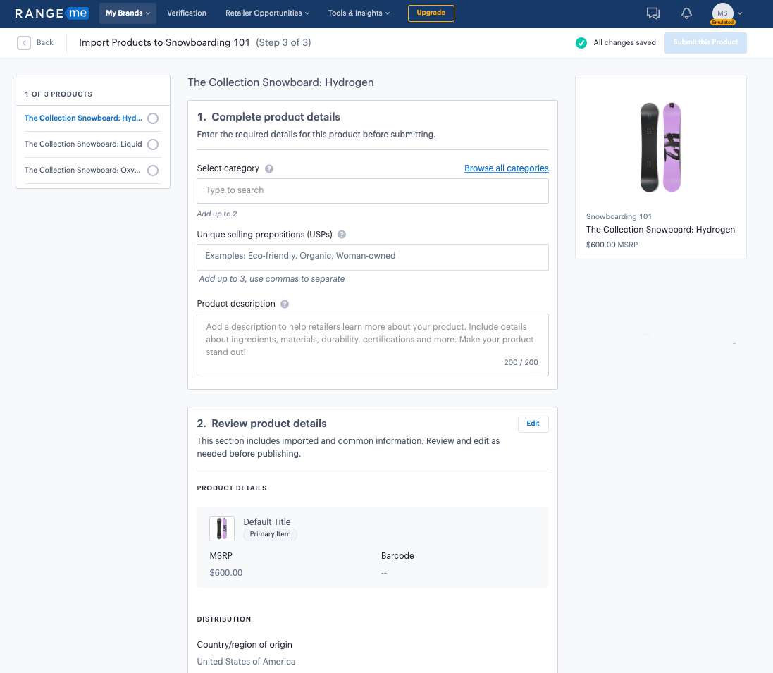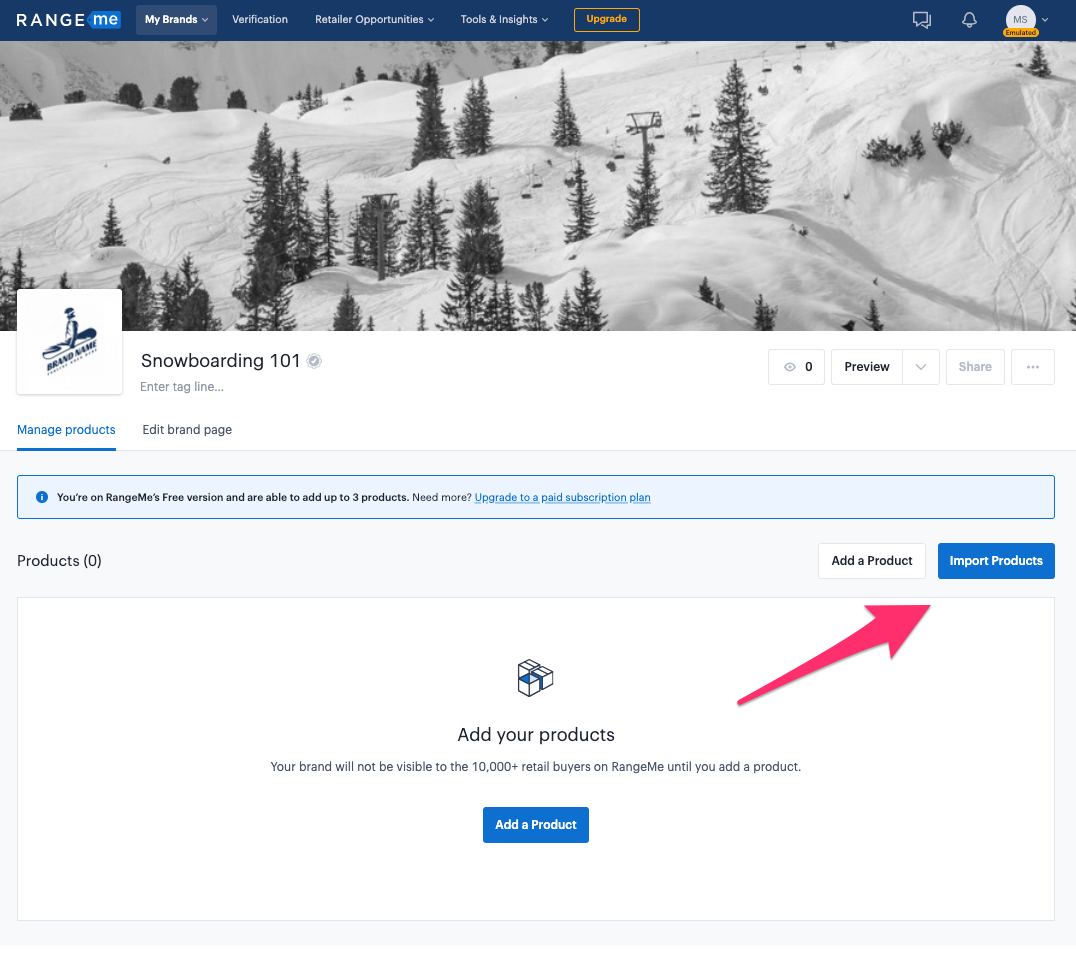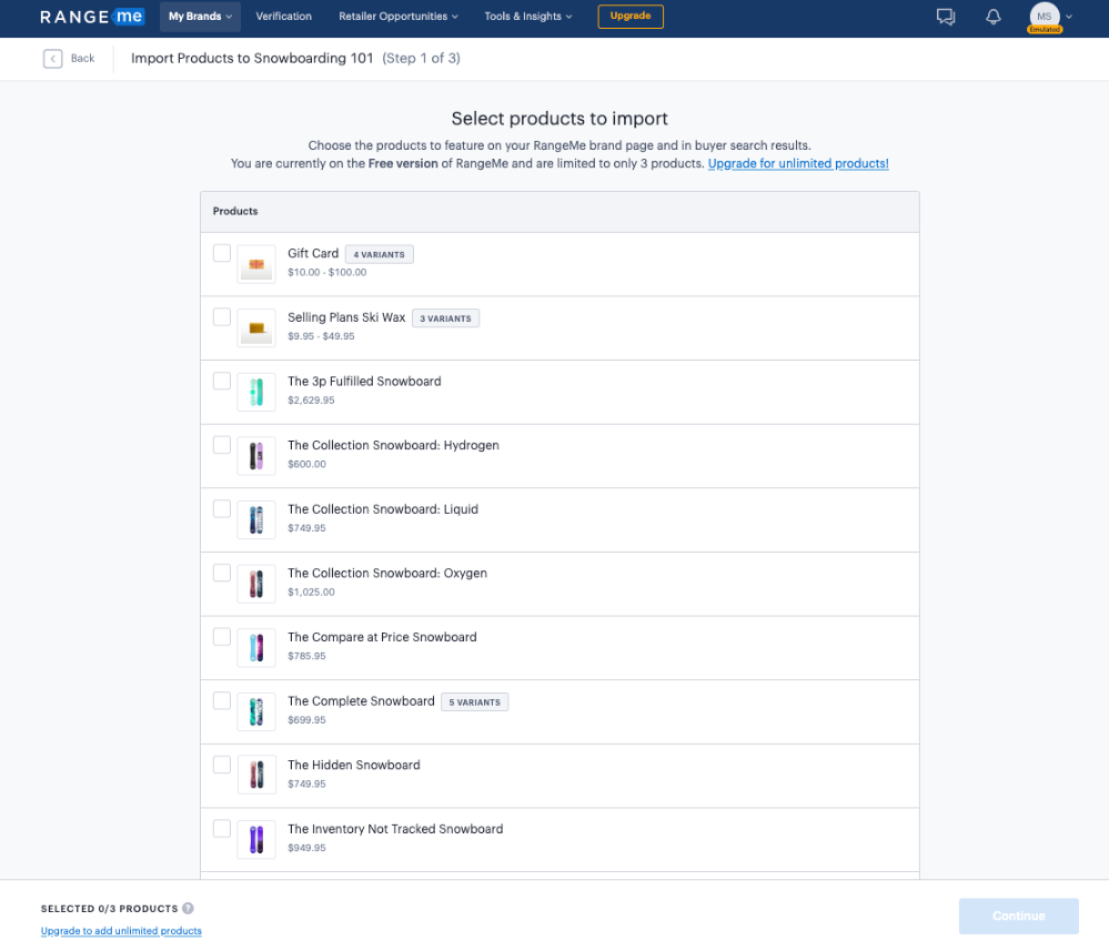 Si tienes éxito, serás redirigido automáticamente a tu perfil de RangeMe, donde podrás comenzar a importar tus productos usando la información de tu tienda vinculada.