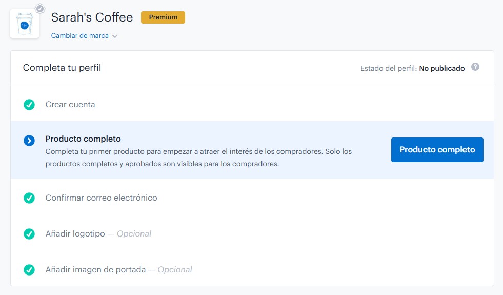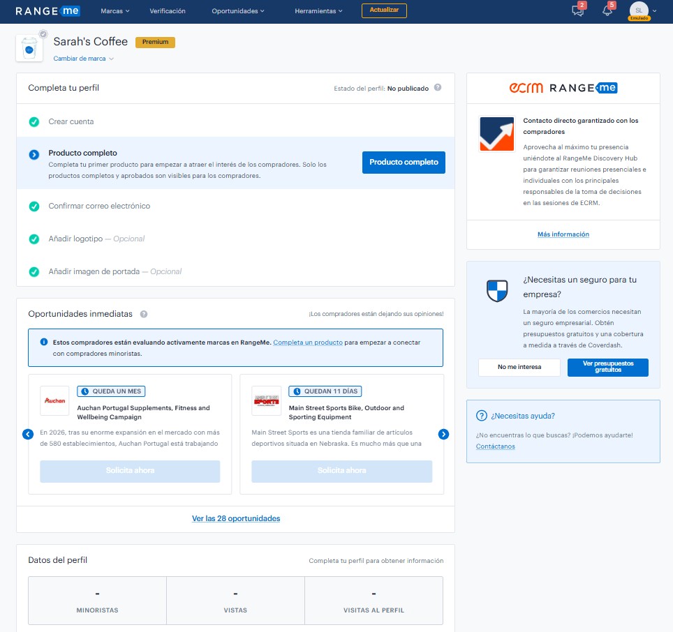 Si eres un proveedor nuevo en RangeMe, llegarás a tu página de inicio del proveedor. Aquí puedes seguir instrucciones paso a paso sobre cómo publicar tu primer producto y completar tu perfil en RangeMe.