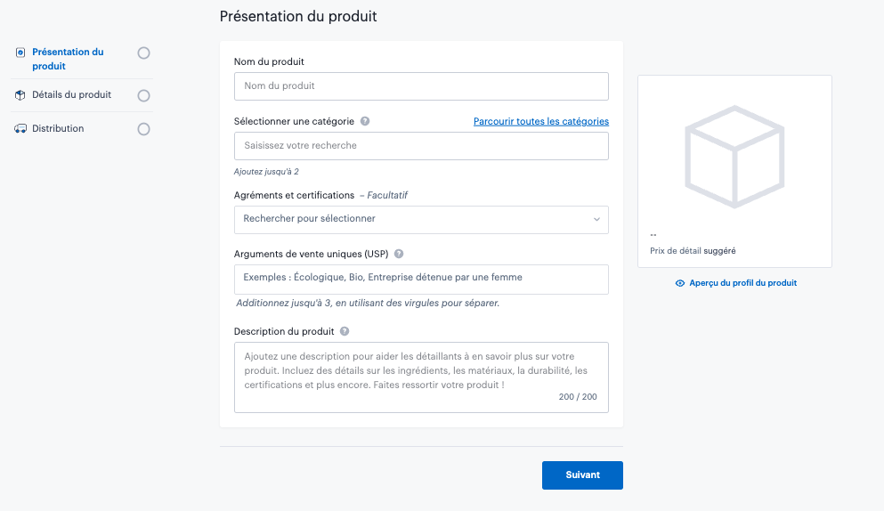 Le champ description permet aux fournisseurs de fournir aux acheteurs des détails essentiels sur le produit. Nous recommandons de la garder courte, en se concentrant sur les informations les plus pertinentes concernant votre produit pour aider les acheteurs à décider s'il conviendrait à leurs magasins. Veuillez noter qu'il y a une limite de 200-caractères (et non de mots).