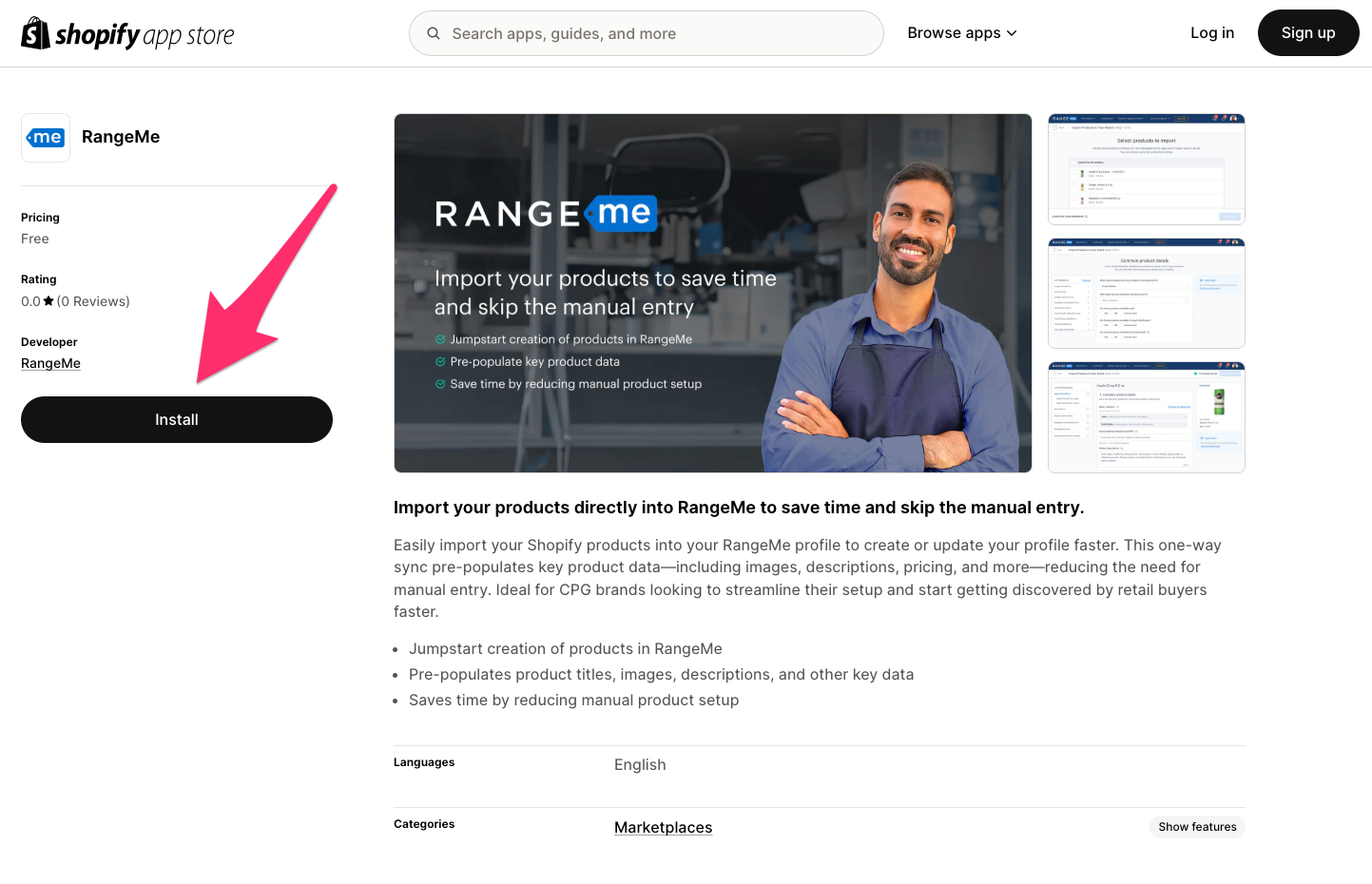 Une fois dans la boutique d'applications Shopify, cliquez sur Installer pour l'application RangeMe, puis suivez les étapes d'authentification requises pour lier vos comptes.