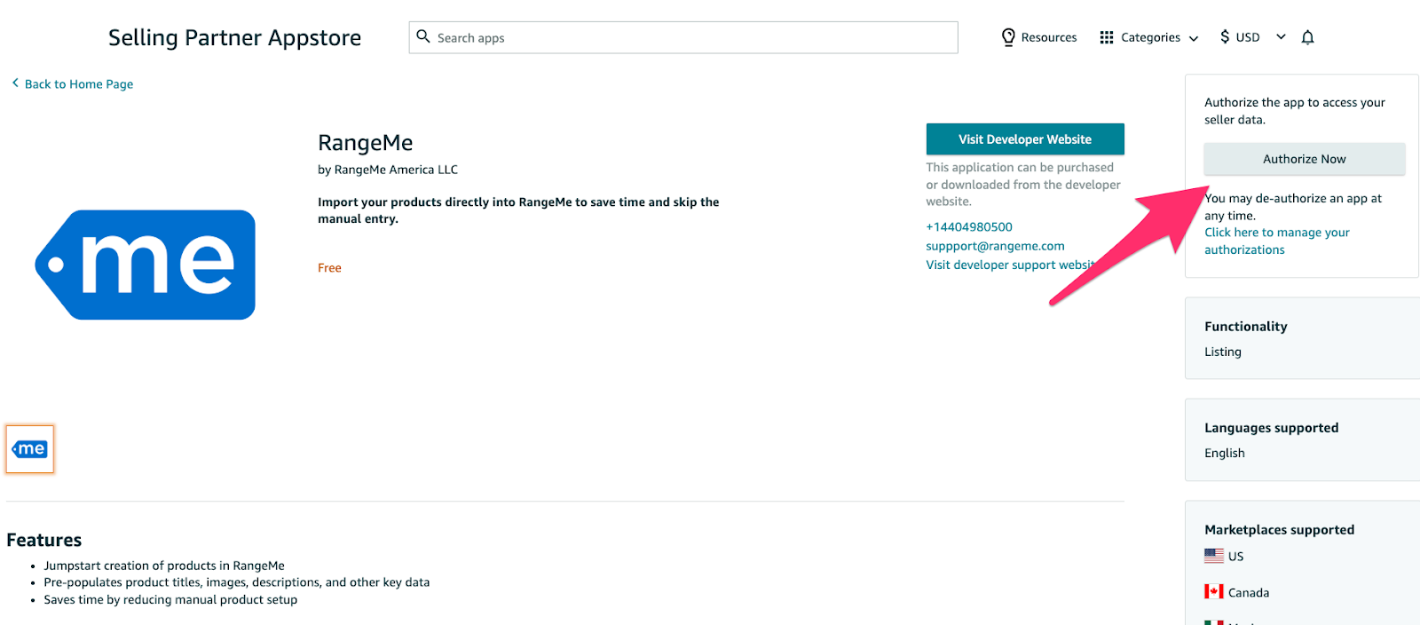 Vous devrez spécifier votre marché Amazon Seller Central. Sélectionnez votre région et cliquez sur le bouton bleu Continuer pour être redirigé vers la fiche de l'application RangeMe sur la plateforme Amazon.