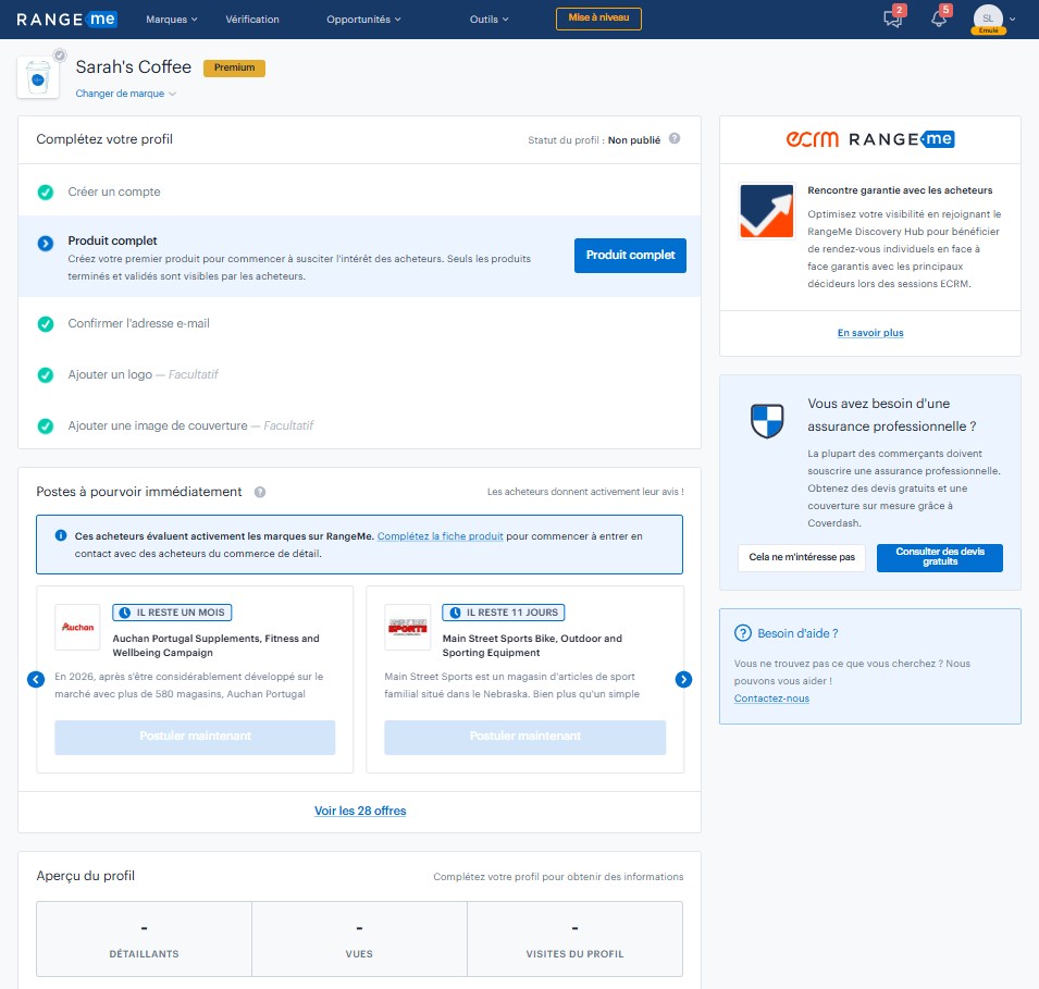 Les fournisseurs RangeMe peuvent désormais explorer leur compte RangeMe et consulter en un coup d'œil des informations importantes sur leur(s) marque(s) depuis la page d'accueil fournisseur. Les fournisseurs peuvent revenir à leur page d'accueil à tout moment en cliquant sur le logo RangeMe en haut à gauche de la barre de navigation.